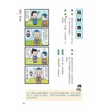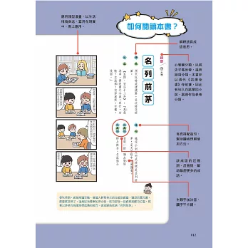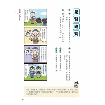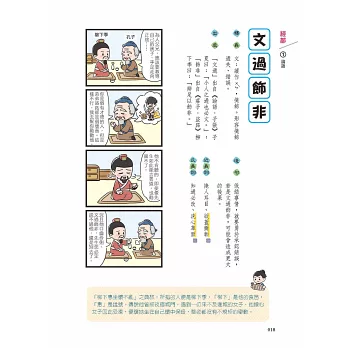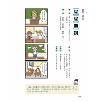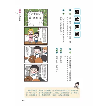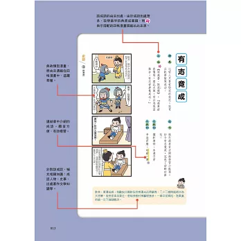 ◎ 四格漫畫的表現方式為兩類,一為畫出成語的歷史典故,方便讀者理解來龍去脈;二為成語的現代應用,讓讀者了解情境,能夠快速應用。