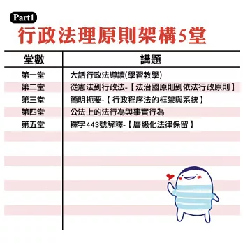 幫助一開始還沒有法學基礎的考生,快速建立體系思維及框架。範圍包含:(1)行政法一般法律原則體系(2)理解行政程序法相關架構(3)行政行為簡要及概略講解。