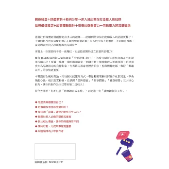 本書沒有生硬的理論,用人人能懂的方式,帶你輕鬆理解如何操作社群流量、學會業配心法、吸引忠實粉絲,並掌握「品牌價值」「故事體驗」「社群經營」三大核心能力,讓你的創作為自己帶來第二份收入!
