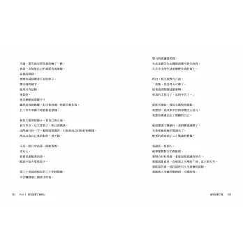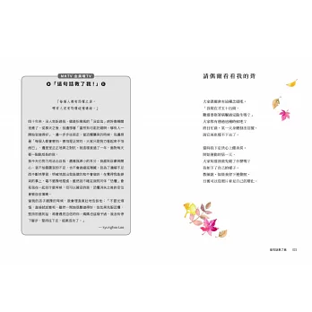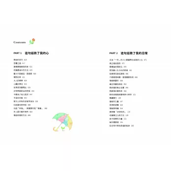 最後,我想告訴大家閱讀這本書的訣竅。一頁一頁翻,當發現哪句話打動您的心時,請用漂亮的螢光筆畫底線吧。在那一瞬間,那句話就成為您的故事。每當生活疲憊的時候就翻開書,讀一下用螢光筆標記的那句話,您會感受到內在的勇氣與自信逐漸變得強大,希望我和大家一起創造出的這本書,能成為更多人的「這句話救了我」。