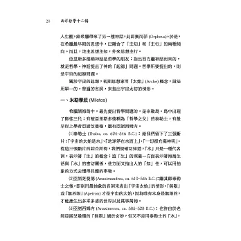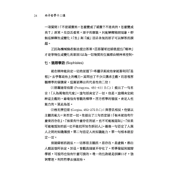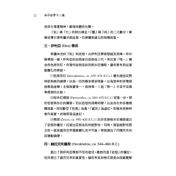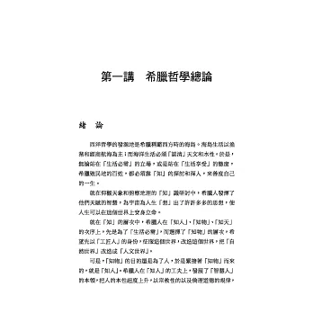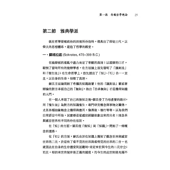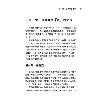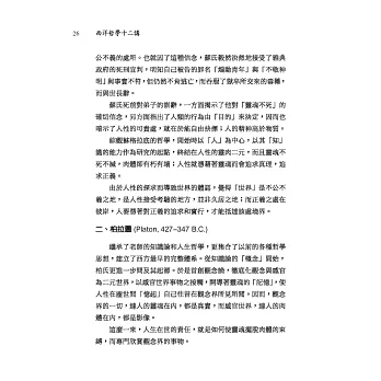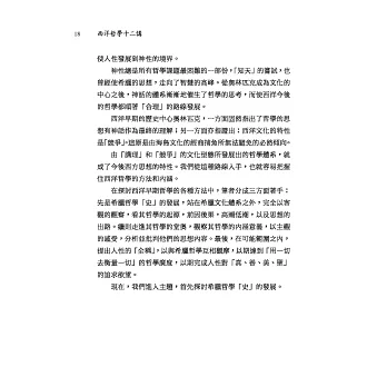 本書將西洋哲學史分為希臘、中世、近代、現代四個斷代,每個斷代各選二位足以代表該時期的哲學家,深入淺出地介紹其哲學思潮與特色。
