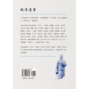 《晚清遺事》內容極為豐富,可謂琳瑯滿目,美不勝收,而由於篇幅過大,因此分為正、續編出版。書中提及的人物有龔定盦、袁子才、王湘綺、曾國藩、左宗棠、李鴻章、張之洞、張謇、載灃、端方、夏壽田、羅振玉、哈同、曾紀芬、陳三立、譚嗣同、吳保初、丁惠康、辜鴻銘、胡雪巖、袁世凱、張佩綸、彭玉麟、翁同龢、瞿鴻禨、李文田、寶竹坡、吳樾、楊崇伊、咸豐皇帝、慶親王、康有為、徐世昌、清道人、盛宣懷、冒鶴亭、溥心畬、溥雪齋、溥傑、嵯峨浩等等。涵蓋的範圍非常廣,有皇帝王公大臣、疆吏大員、名士才子、財閥讒臣、富商烈士、王孫畫家等等不一而足。而如曾國藩、左宗棠、李鴻章、張之洞、張謇、辜鴻銘、王緗綺、溥心畬等人更同時有多篇文章來描述他們,從不同的角度切入,讓你能做一更全面的觀照。