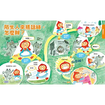 本書藉由耳熟能詳的童話故事與角色,建構出潛藏危機的場面,如遇見大野狼的小紅帽,以及和手足一同看家的七隻小羊。孩子可以輕易察覺危機所在,並和角色一起思考合適的應對方式。待孩子年齡更長,家長可以延伸出題,幫助孩子應對更複雜的情境,學會更多保護自己的方法。