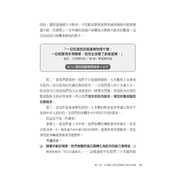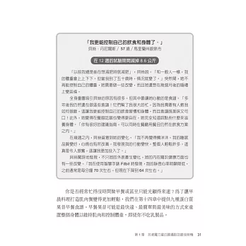 這個方案不是低碳水化合物或低脂肪,它不需要計算卡路里或限制攝取食物的時間,也不用戒除任何特定的食物類別。一旦你抓到要領,並將其融入日常生活中,它可以讓你在短短十二周內減掉8.5公斤—其中絕大多數都是脂肪—同時讓你保持肌肉質量,維持新陳代謝,並對血壓和其他健康關鍵的指標帶來正面的影響。此外,它甚至可以大幅降低罹患許多慢性老化疾病的風險,從而促進身體和大腦整體的健康。
