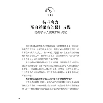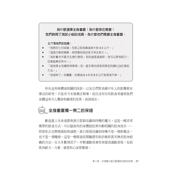 《全身重置》應用最新的減肥科學——研究的對象主要不是針對動物、一般大眾,而是針對我們這個年齡層。(因為我們的身體不同,研究一種食物對酵母、果蠅、囓齒動物或二十多歲的運動員的影響,並不等同於它對我們黃金時期體質的影響)。它揭示蛋白質攝取的時間點—全天攝取適量的蛋白質—如何預防老年脂肪增加並維持結實的肌肉組織。這種方法,再加上大量的纖維、維生素和礦物質,以及健康的脂肪,不僅可以幫助我們重塑身體,還可以重塑我們的生活,這就是全身重置的基礎。