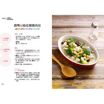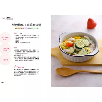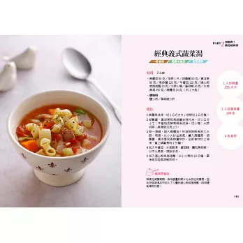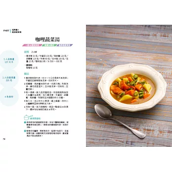 每道蔬菜湯詳細說明1人份的熱量、蔬菜量和蔬菜種類,控制每天蔬菜食用量達標。