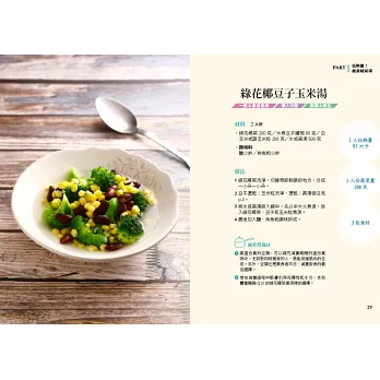 書末加入「常見瘦身食材營養成分表」、「常見食物酸鹼度表」和「常見食物的GI值表」等,學會自由置換食材。