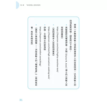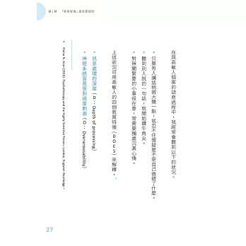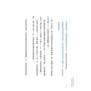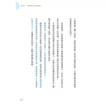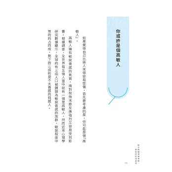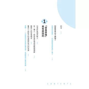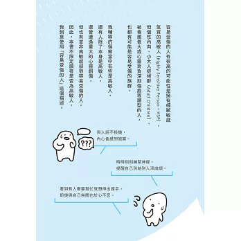 高敏感是一種氣質,高敏氣質足以影響一個人的個性以及人生,高敏人的神經系統容易激動高昂,一不小心就鑽牛角尖,環境上微小的變化便能觸發高敏人的強烈反應,也容易搖擺不定⋯⋯我愈深入鑽研高敏人的一切,愈明白高敏人何以容易受傷。我逐漸掌握了高敏人應對人際關係的訣竅。