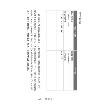 3.提供實用方法,包括:若則計畫、重新評估、標出控制地圖、決策平衡、優勢報告,都有表格讓讀者做練習