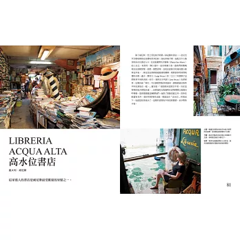 每家書店都自成一格,充滿玄機。有些崇尚極簡概念,有些彷如迷宮像是華麗殿堂,座落地點更是包括私人公寓、水上船隻和歌德教堂等出人意料,只能驚嘆。本書帶領讀者遊歷世界各地獨一無二的60家書店,發掘其中寶藏,認識它們的經營者,了解書店主人如何能讓尋常的銷售場域,化為一場場讓愛書人難忘的文化經驗。