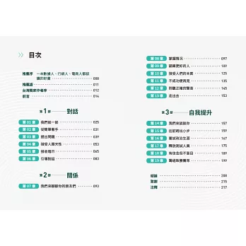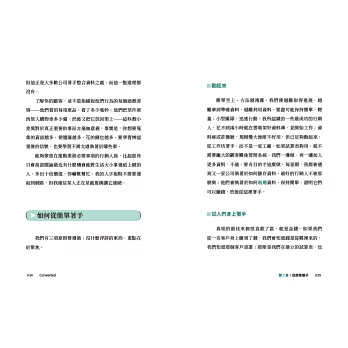 我們將從對話以及與客戶互動的重要性談起:怎麼做、要有什麼預期、不該做什麼。第二部則是討論關係:你的事業取決於培養良好關係,同時節省你浪費在無用關係上的時間與金錢。第三部為自我提升,也就是自我反省─問自己正確的問題、避開自我欺瞞的陷阱,因為那必然會拖累你的進展。