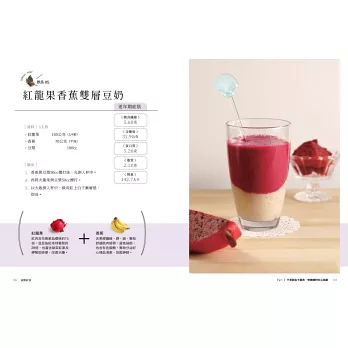 ◆〔更年期蔬果飲〕紅龍果香蕉雙層豆奶──紅肉龍果含花青素為櫻桃的15倍,可幫助排便,改善水腫。香蕉可舒緩肌肉疲勞,幫助分泌好心情血清素,放鬆神經。
