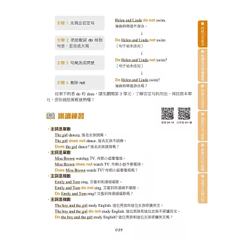 總是覺得文法書的說明很困難,即使背了文法公式,還是沒辦法開口說英文嗎?這是因為,母語人士學習文法根本不用靠背!他們在日常生活中不斷用英文聽、說,反覆使用同樣的句型模式,所以不用死背,自然而然就能熟悉其中的文法規則。因此,本書除了簡單易懂的文法解說以外,也針對每個文法規則的句型模式,特別設計完整表現文法特性的跟讀句組,並提供慢速、正常速雙版本音檔,只要一邊聽音檔、一邊跟著唸,就像是母語人士一樣,把文法實際用出來。只要反覆練習,就能自然養成語感!
