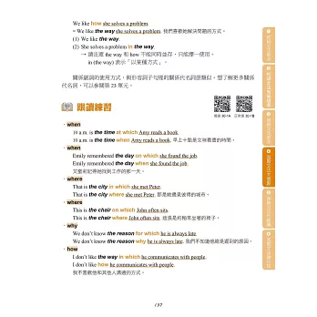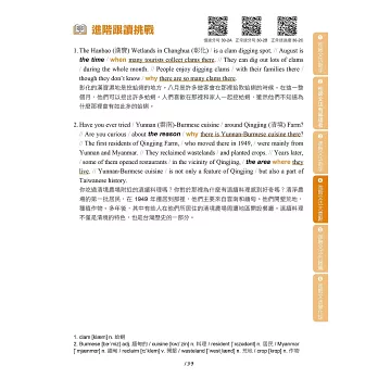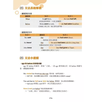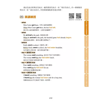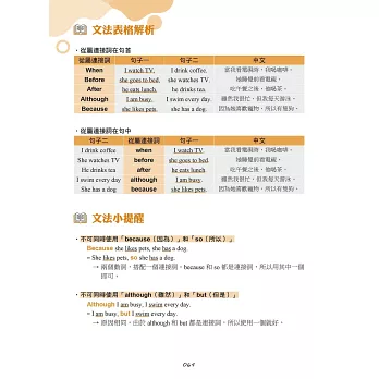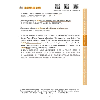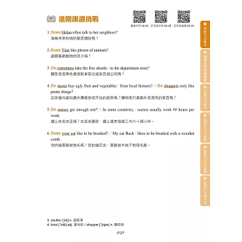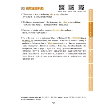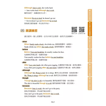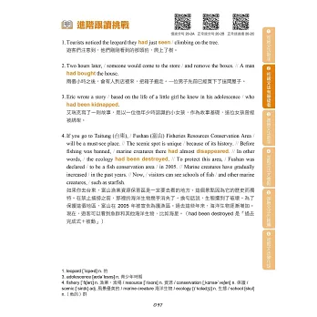 在學習文法之後,如果能夠將文法能力運用在閱讀與口說方面,就能更全面提升英語能力。本書每個單元的最後,提供進階句子與段落跟讀,除了活用該單元學習的文法以外,也訓練讀者逐步適應較長的文章內容。在跟讀的過程中,讀者能夠練習閱讀長篇文章,並且熟悉說出一段完整敘述的感覺,對於準備英檢閱讀與口說測驗也很有幫助。