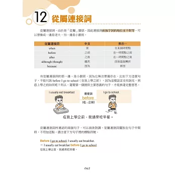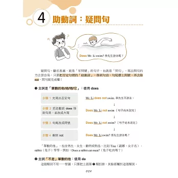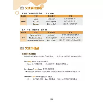 在文法學習與跟讀之後,本書也提供句型整理表格,視覺化呈現句型結構,不用死背規則,也能一眼「看」懂文法的架構。讀者也可以嘗試替換句型表格中的詞彙,創造更多不同的句子。
