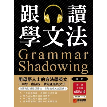 傳統文法學習的盲點,就是在腦中塞了一大堆文法公式,卻不知道如何實際使用,需要用英語溝通時還是支支吾吾開不了口。事實上,文法並不是死板的知識,而是活在每天實際的會話應用中,每次聆聽、開口說出英文句子,就是一次熟悉文法的機會,所以母語人士即使不刻意學習,也能自然地使用文法。因此,本書將文法融入跟讀練習,透過特別設計的句子組合,一邊聽音檔、一邊跟著唸,就等於反覆運用特定的文法概念,同時也能熟悉句型變化模式,唸著唸著就能養成英文語感。