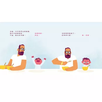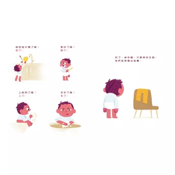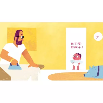 小孩逐漸發展自我意識時,開始會對自己的穿著有主見,卻不一定能選擇「適合」的服裝,於是就會出現各式各樣的奇妙穿搭,書中小男孩不願穿褲子的畫面,也是許多家庭都會遇到的熟悉事件。