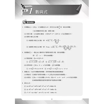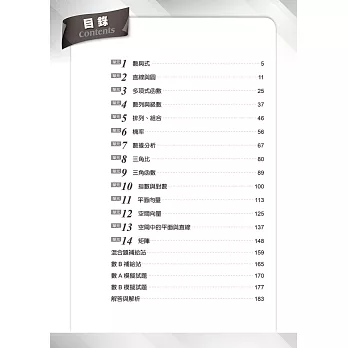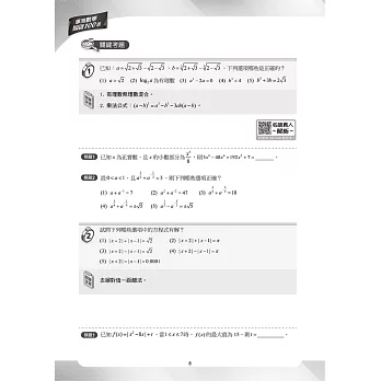 各單元題型分為基礎題型、關鍵考題、精選類題。另外加入數B專區,方便數A跨考數B或只考數B的學生使用。