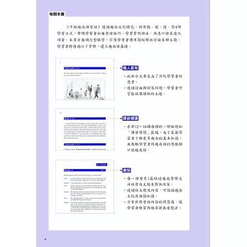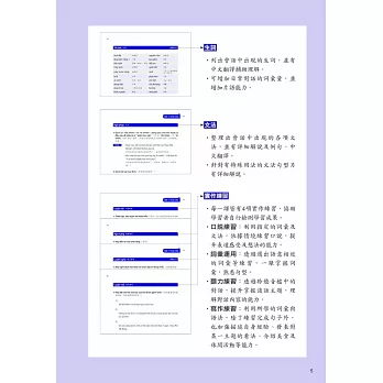 3.並有「口說練習」、「詞彙運用」、「聽力練習」、「寫作練習」等全方位的實作練習,協助學習者將「聽」、「說」、「讀」、「寫」4大技能融會貫通。