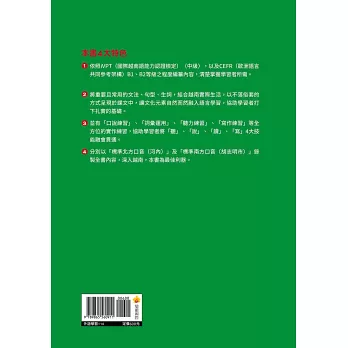 1.依照iVPT(國際越南語能力認證檢定)〈中級〉,以及CEFR(歐洲語言共同參考架構)B1、B2等級之程度編纂內容,清楚掌握學習者所需。