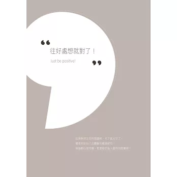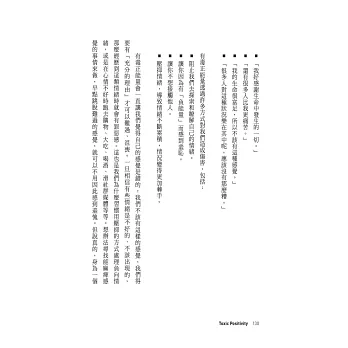 正向思考被包裝成解決問題的萬靈丹,推銷給所有人。從汽車保險桿上的負能量退散貼紙,Instagram上排版精美的肯定小語,再到印有「生活真是美好」的T恤,還有諄諄教誨「再多一點點正能量,幸福就在不遠處」的大師們。我們不斷被告知「凡事往好處想」,才能避開痛苦經驗與感受,擁有幸福歡樂與正能量。但這並不是本書想帶給你的。這本書會談及你日常慣用的說話方式和常用語句,這可能會令你不舒服,但希望這能讓你進一步思考自己是如何以幸福之名,行隱藏真實感受和需求之實,並同時想想為了散發正能量,你又如何忽視自己或討好別人。我期待透過本書,幫助你練習表達自身需求、與他人建立更全面的關係,而不是只肯接受美好時光,對其他部分都眼不見為淨。