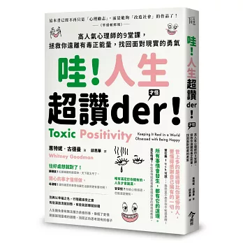 曾幾何時,幸福與保持正向成了人生的目標與義務,到處都有人要我們懂得感恩或正向思考。如果遇到衰事,肯定是因為你「心態不正」或「不夠努力」。我非常驚訝有毒正能量居然已對生活造成如此巨大的影響,並出現在我們的職場、家庭以及關係裡;此外,它也是一股助長性別歧視、種族歧視、恐同、恐跨性別、殘疾歧視、階層歧視或其他各種偏見的強大力量。它真的無所不在。
