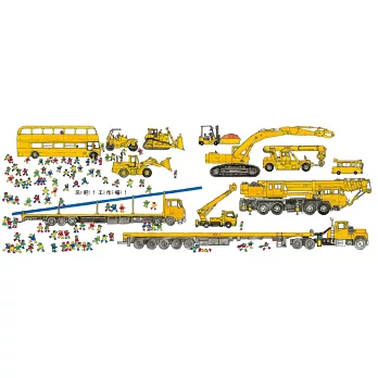 還有,大家可別以為我們小人兒都長得一樣喔,仔細看看,我們的分工細得很呢!首先要穿上屬於自己的工作服,還要戴上保護頭部的安全帽,有人專門駕駛工作車,有人負責指揮方向,有人要負責看設計圖……哎呀!還有人跑太快不小心跌倒了呢!我們雖然個子小,但是工作起來可是團結一致,而且過程中充滿歡樂,大家在看我們工作的時候,也可以看看我們每個人認真工作的表情、很有架式的動作,和最有效率的分工。