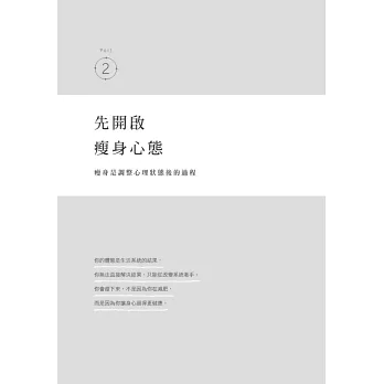 準備好你的身心,收拾好你的行李,再安排好你的環境,讓我們一起翻開這本書,踏上專屬於你的瘦身之旅吧!