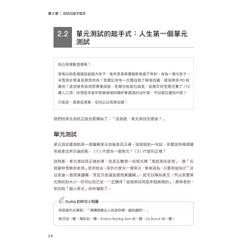 「這是一本勸世的書,但透過 Kuma 的文筆卻能寫得有趣直白。期待透過這樣方式的呈現,能讓更多朋友了解單元測試的知識、重要性與必要性,解救沉淪於苦海的開發人員,讓他們得以用正確的方式,奪回自己寶貴的青春。」──── Odd-e Agile Coach│Joey Chen(91)