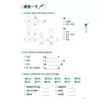 共有58篇練習,題型包含填字遊戲、連連看、圈圈看、配對等等,測試孩子們是否將課程內的單字認識清楚並能拼寫正確,這部分可能上國中的同學比較能夠掌握。