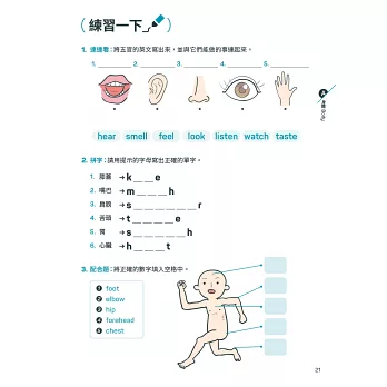 而上了國中的學生,也可以利用本書場景歸類的方式更有效率的背誦單字,並獨立閱讀會話單元以及完成拼字練習。因此本書除了是國小生必備的英語單字學習書之外,還能延續使用到國中階段,是實用的英語課外閱讀素材。