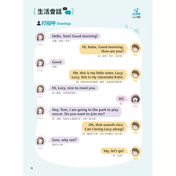 本書共有53篇會話,運用到的多是範圍內的字,更容易了解單字實際用法。而會話內容圍繞著一家人的生活與朋友、老師間互動,都是日常生活會遇到的情境,幫助讀者在生活中運用。