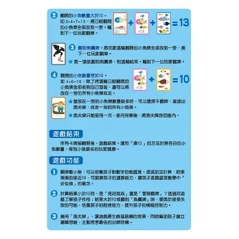 透過遊戲方式,讓孩子自然而然建立數學中「近似值」的概念、練習數數、訓練加法;在比賽的過程中,訓練邏輯思維,思考如何讓自己獲勝!
