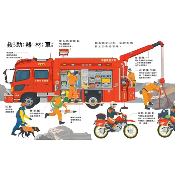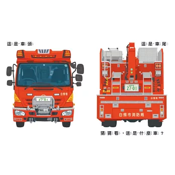《災難救援車大集合》讓小朋友從車頭、車尾和側面來觀察救援車輛如何運作,