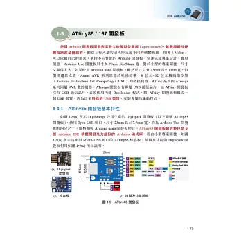 本書硬體使用ATtiny85開發板、周邊元件及模組皆可在電子通路或網站上購得且價格便宜。ATtiny85 開發板最大特色是支援 Arduino IDE 軟體開發及大部份的Arduino 函式庫。