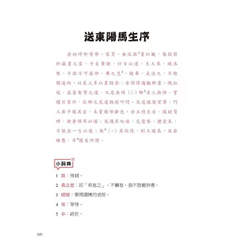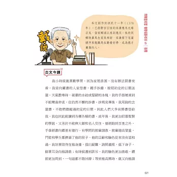 這套書中所選的古文,遠的離我們兩、三千年,近的也離我們一、兩百年,不僅有時代上的隔閡,還有語言上的障礙,且不說你們這些孩子,就是我們這些大人讀起來也很困難。古代的散文名篇,就像包著硬殼的美食,大家都知道裡面是佳餚,就是不知道如何來吃它。