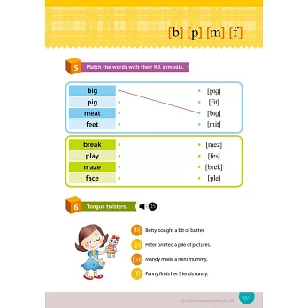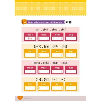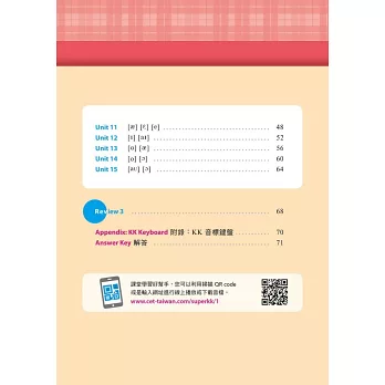 本書採用全新的學習方式,讓發音學習者不再害怕 KK 音標。精心規劃的課程進度,豐富多元的練習題型,結合 QR Code 即時聆聽正確發音以及觀看教學影片,除了幫助學習者快速把 KK 音標的符號記好背熟以外,也能更加熟悉自然發音的複雜規則,真正做到「看到任何單字都能唸出來」。