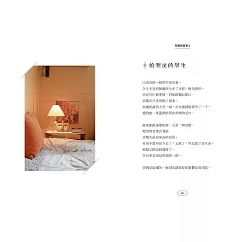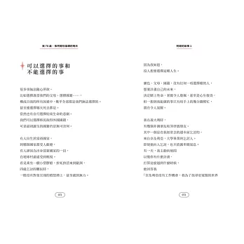 1. 本書扣緊近四大主題:自尊、充實、品味、責任,用多篇身邊的故事寫下所見所聞,以及柔軟且充滿彈性的想法。因為新冠肺炎疫情的關係,有許多人經歷了人生的重大關卡與轉變,處於徬徨無助的低潮中,本書讀來除了能幫助讀者反思及梳理自己的人生,獲得淡淡撫慰,並能得到重新整理人生的許多想法。這本書既非單純人生傳記,也非單純心靈雞湯,而是讓讀者在作者不設限的話語中,獲得心靈的平靜。
