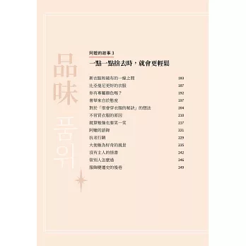 2. 用字淺顯易懂,內容囊括讀者會關注的所有話題:自我風格、YouTuber、婆媳關係、斷捨離、樂齡生活、時間管理、自我實踐、時尚服裝、海外留學、性別意識、去差別化⋯⋯,為她的「人生態度」所著迷的韓國讀者們留下眾多好評。書中也介紹許多韓國文或與義大利文化,以及服裝設計變遷史等,明快流暢的文筆讀起來輕鬆順暢。