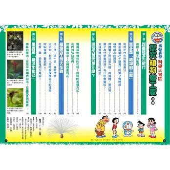 哆啦A夢和他的夥伴們一路尋訪植物科學工廠,從葉子、花朵、果實、根、莖到種子,千變萬化的植物世界讓人看得目不轉睛,而植物們各種適應環境的生存法寶與招數更是讓人嘖嘖稱奇。