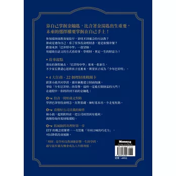 本書採用說故事的寫作方法,拿「擦鞋童理論」驗證航海王的興衰,用「菸屁股理論」說明如何利用股災買進被低估的好股票,再藉由《火影忍者》中漩渦鳴人的「多重影分身」,講解幫自己建立財富分身的技巧。書中的男主角小銘開了一家螞蟻飲料公司,藉由這個過程講解公司的資產負債表、毛利率、營益率、業外損益等知識,幫助大家學習如何挑選出一家好公司。