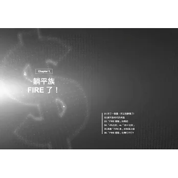 本書共分為七章,第一章「躺平族:FIRE 了!」,由一本日文書「1 億円貯 まったので、会社を辞めました。」(存了一億圓,所以我辭職了)談起,敘述一位 18 歲高中畢業生,從未做任何投資,僅靠儉約生活,在 51 歲時共存了一億日圓, 就辭職不幹了,偶爾當義工隨性過活;到底一位僅高中學歷,工作 33 年,是過 怎樣的儉約生活,而存下一億日圓,可能嗎?2021 年日本≧65 歲夫妻之存款中 位數為 1,588 萬日圓(≒365 萬元台幣)。
