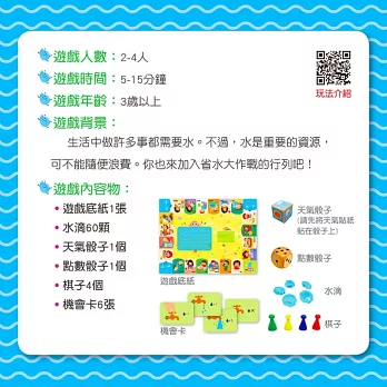 另有搭配本桌遊延伸學習概念設計的圖畫書【尋找寶水球】,讓孩子聽故事、玩故事。