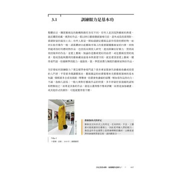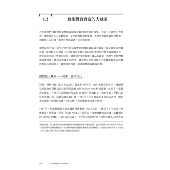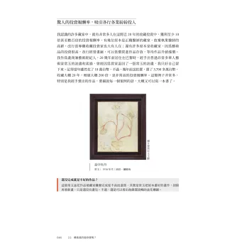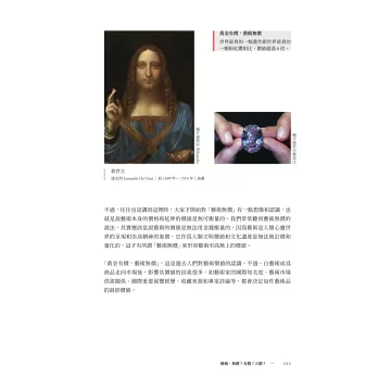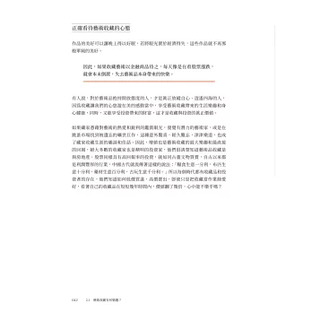 藝術經紀王玉齡,集結30多年來在藝術經紀與收藏投資領域的經驗與觀察,讓零基礎的新手也能建構藝術收藏投資的世界觀,並歸納出「欣賞→收藏→投資」三部曲,先學會欣賞藝術,從中找到樂趣以及自己最想收藏的作品,才能精準地掌握它的價值。