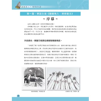 感謝(依賜稿時間先後排序)蔡淑芬校長、康原大師、葉澤山局長、謝四海校長、林秀蓉老師共五位尊敬的師長賜序,彭韻錚總經理、許光華校長、謝振宗校長、何政謀校長、謝慧民教授、李人傑會長、徐婉禎教授、陳進孟理事長、章惠芳老師、張良澤教授、張志全校長、徐貴壕董事長、粘素真理事長、吳東明秘書長、顏聖哲教授、林珀姬教授、詹評仁顧問、張曉玲館長、羅家強校長、林錫銓教授、林藝芳主任、謝旻淵校長、連紋乾校長、李宗銘老闆、洪思農校長、方忠秀老師、徐震魁校長等二十七位藝文教育界有志之士為文推薦,增添本書光彩,激勵編著者更大的動力,非常感謝。