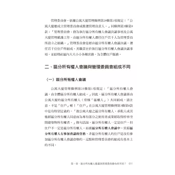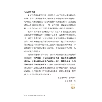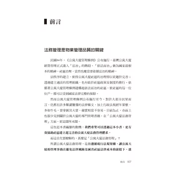 然而公寓大廈管理條例公布施行至今,對於大部分民眾而言,仍舊有許多艱澀難懂的法律條文,加上行政法規經年累積,多如牛毛,要掌握其大要,確實相當不容易。目前為止,市面上也很少見到關於公寓大廈的專門管理書籍,在「公寓大廈法務管理」方面,更是聞所未聞。
