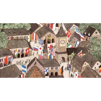 ★安野光雅曾在訪談中提到,《旅之繪本》的靈感來自於一次飛機即將降落的時刻,從空中已經可以看到住家的屋頂,雖然是文化完全不同的異國,但一樣有熱鬧的市場,有人在種田,有教會跟銀行,讓他興起了想用這個視角描繪人們生活的念頭。在《瑞士篇》中,為了描繪壯闊的阿爾卑斯山脈,可以發現視角與以往有些不同,小烏利也現身在畫中敲著門尋找鈴鐺。而根據未公開畫稿完成的《荷蘭篇》,有許多安野鍾愛的畫家,視角也更自由寫意,最後旅人在畫面上方還回了馬,這趟從1977年啟程的班機也彷彿伴隨著低垂的晚霞緩緩降落,留下對旅人悠遠綿長的思念。――謝依玲(作家、譯者)