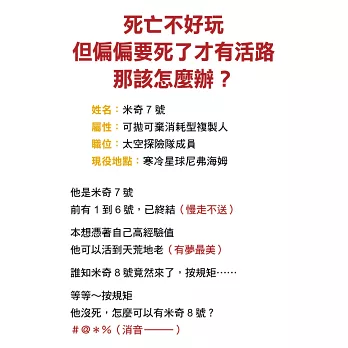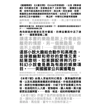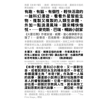 ※《星艦戰將》《火星任務》《2009太空漫遊》,以及《戰爭遊戲》中的最佳元素,全都融合進了《米奇7號》,讓讀者在虛構、但有可能成真的未來時空中,與主角一同在道德、哲學、意識與生命的意義邊緣探索新的可能性;也別忘了,在8號醒來前多吃三百卡循環糊!──馬立軒,中華科幻學會常務理事