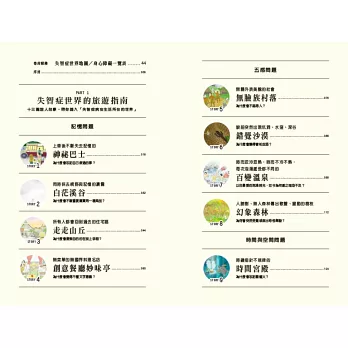 上車後不斷失去記憶的「神秘巴士」、無法辨識人臉的「無臉族村落」……失智症患者眼中的世界,以及他們生活上的種種不便,盡數攤在我們的眼前。換言之,這十三篇旅人故事可以帶你體驗「失智症患者生活所在的世界」。