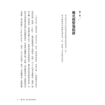 2.最新的「堅強」定義:本書直指現今被大眾吹捧的建立自信方法,實際上造成人眼高手低、虛張聲勢、藥物成癮的假自信社會現象,他指出要達到堅忍不拔、不被外在困境打敗的真自信,須從一連串完成的小型成功開始培養起。